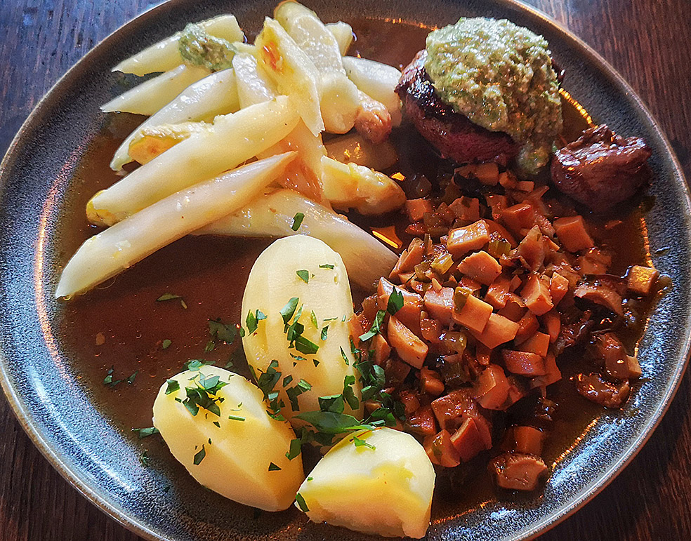 Gekocht habe ich gebratenen Spargel und Kartoffeln zu einer Reduktion von Rehknochen mit Kräutersaitlingen. Dazu Rehrücken mit einer Pesto aus Tannensprösslingen.