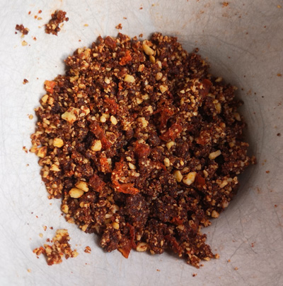 Ein Teil des Rotkohls wird zu einem Salat, gewürzt mit Mole und Kaffee - eigentlich Kaffeeöl, das hab ich aber grad nicht. Mole ist eine fantastische Gewürzmischung aus Mexiko, bestehend aus Chilli, Kakao, Sesam, Tomatenflocken, Knoblauch und in meinem Fall Cashew statt Mandeln. Dazu dunkler Muskovado Rohrzucker. Das ist eine sagenhafte Mischung, mit der ich weiter experimentieren werde.
