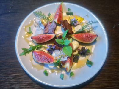 Erst mit in Tannenhonig marinierten Feigen und Schafskäse, garniert mit verschiedenen Kräuterblüten.