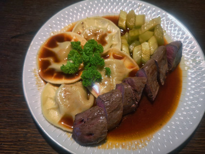 Inspiriert ist das Ganze von Viktoria Fuchs und ihrer großartigen Küche im Restaurant des Spielweg Romantik Hotels, in dem wir am Freitag waren und von wo ich ihr absolut empfehlenswertes Wildkochbuch mitgenommen habe. Ich muss noch einiges drehen und verbessern, aber die Richtung passt schon mal.