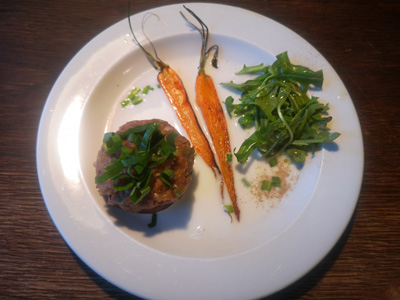 Dann als Tartar in einem gebackenen Champignon mit geschmorten Karotten und schließlich rosa gebratener Rehrücken mit Ravioli mit Spargelfüllung, einem Wildjus und karamellisiertem Rhabarber.