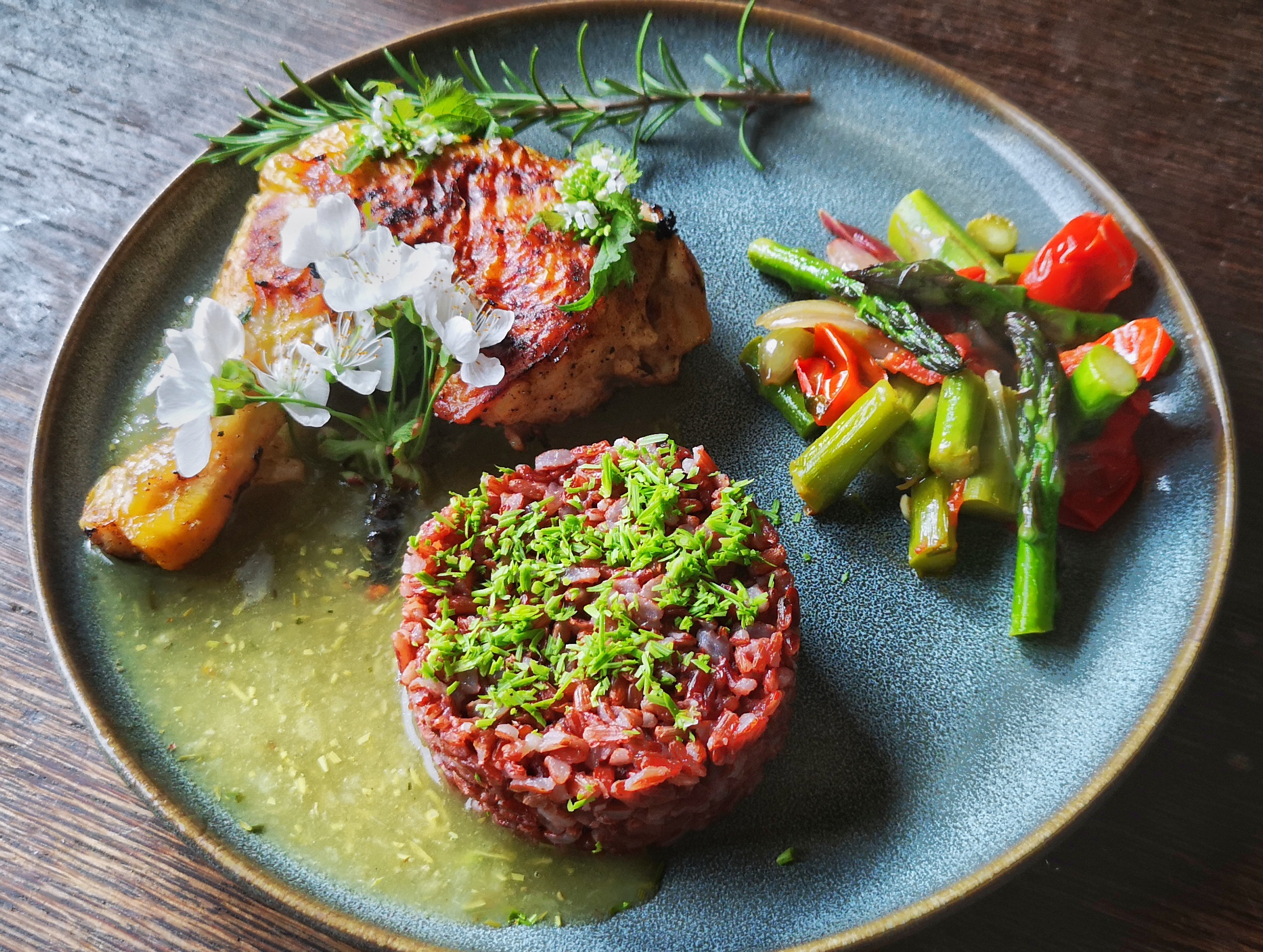 Shio Koji ist fermentierter Reis, der eine Umami-Qualität ans Fleisch bringt, wie das meines Erachtens keine Sojasoße oder Miso schafft. Salz ist nicht mehr nötig, das Fleisch bleibt saftig und dominiert in seiner Geschmacksqualität - da ist jedes Paprika-Brathähnchen Fast Food gegen. Dazu macht Lydia Spargel-Tomatengemüse und es gibt roten Vollkorn Jasmin-Reis mit einer Sauce aus Hähnchen-Fond, abgeschmeckt mit Rosmarin, Thymian und Kirschblüten-Salz und jungen Tannensprößlingen.
