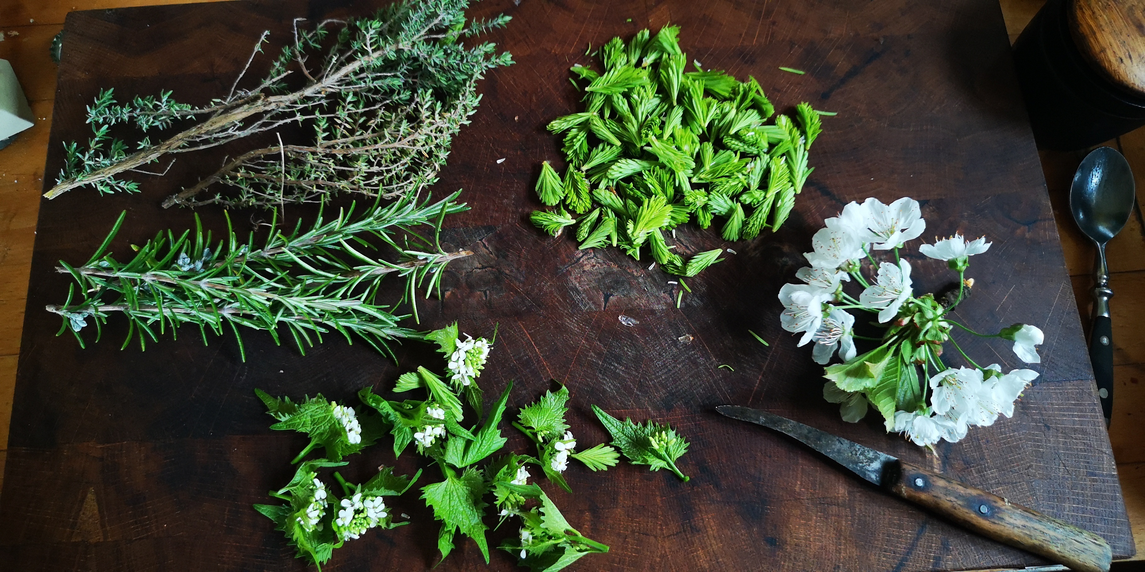 Zu Joep Beving entsteht ein besonders gewürztes Hähnchen-Reis-Spargel-Gericht, bei der Kirschblüten und junge Tannensprößlinge eine wichtige Rolle spielen.