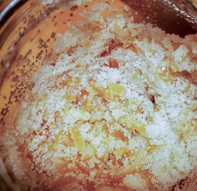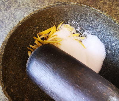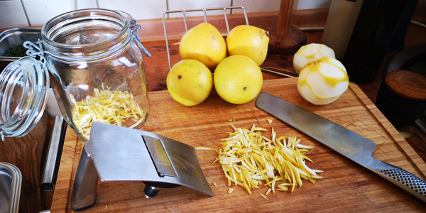 Die hauchdünne gelbe Schale wird in kleine Streifen geschnitten und mit Zucker gemörsert.