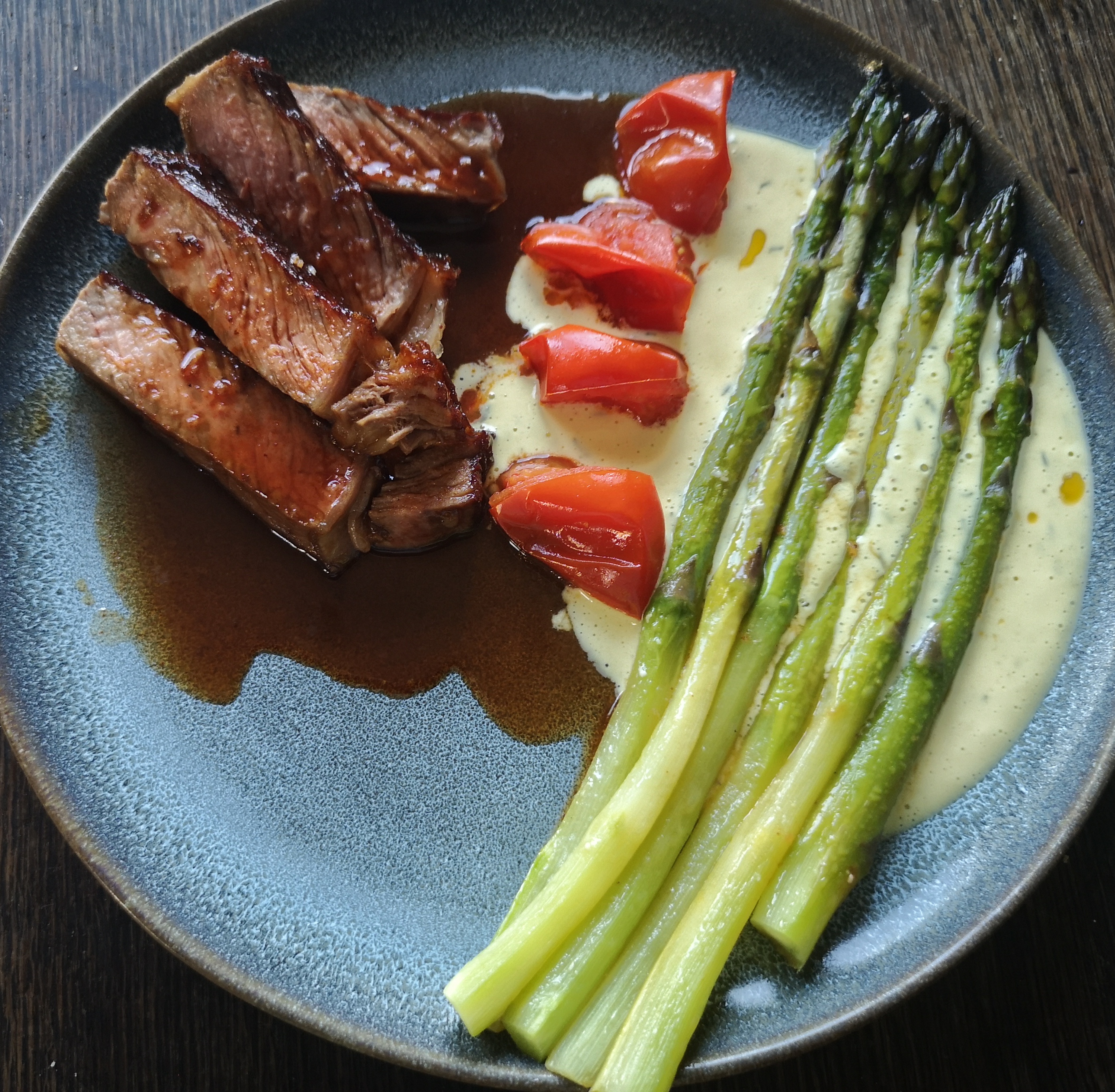 Wie dem auch sei. Dazu gab es Entrecote auf Kerntemperatur 56 Grad Celsius, karamellisiert mit Ahorn-Sirup und mit Kirschblütensalz gewürzt. Das letztere (Sakura-Salz) habe ich vergangene Woche angesetzt. Kirschblüten und junge Blätter sind auf Salz gesetzt und geben ihr Aroma in das Salz ab. Mehr dazu bald.