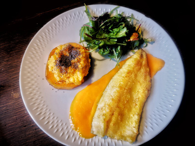 Und so wollte ich auch kochen. Im Mittelpunkt stand die Süßkartoffel. Sie gab es als frittierte Scheibe, auf der ihr Püree lag und mit Blaumohn dekoriert war. Die Soße zum in Butter und mit Maismehl gebackenen Felchen besteht aus Süßkartoffelsaft, der mit Birnensaft und Weißwein aufgepeppt und mit Xanthan gebunden wurde. Dazu ein Wildsalat mit Johannisbeere und Tandoori.