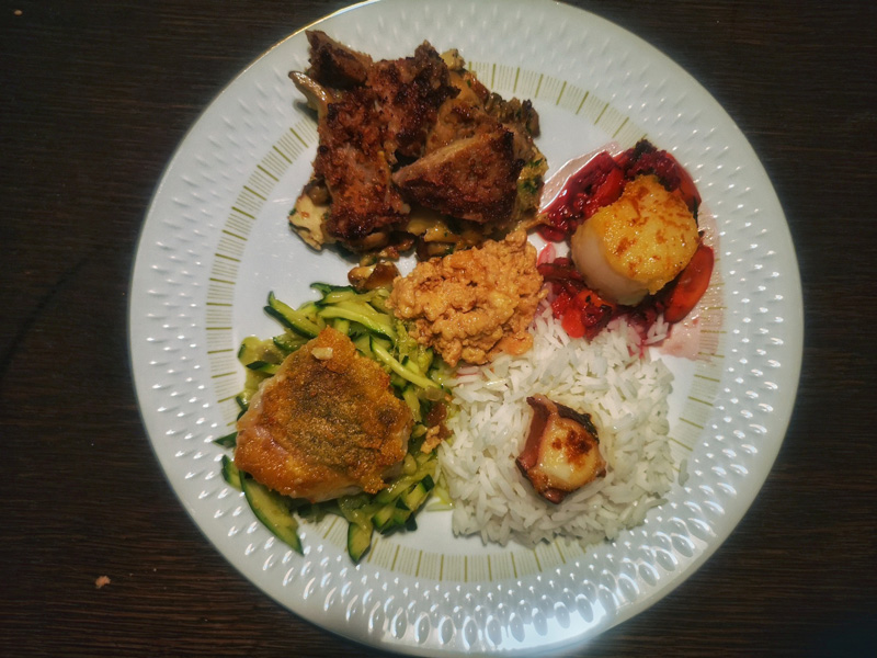 In meiner Kantine gab es Seeteufelbäckchen auf Zucchini-Julienne mit Muskatblüte, Jakobsmuschel auf Sellerie-Möhre-Himbeer-Bett mit Noily Prat und Kalbsgeschnetzeltes auf Steinpilz-Panko mit Petersiliensahne. Dazu Reis mit Kalmar, eine Rote-Beete-Ei-Creme und immer aus dem Hintergrund eine Lea, die in jedem Topf mitrühren wollte. Und Knut hat wieder alles aufgehoben, was runterfiel.