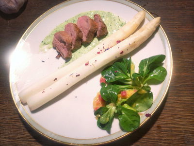 Die Ente mit einer Kerntemperatur von 56 Grad ist vier Stunden in einer 4%-Salzlösung mit Austernsauce und Birkensaft mariniert worden. Sie schwamm dann auf einer Creme aus püriertem Kerbel, Knoblauch, Vanille und Zitronenschale. Der Spargel, bissfest gegart und mit Blütensalz gewürzt, gewinnt durch die Creme dazu. Dabei ein Feldsalat von Lydia angemacht mit Thai-Mango, Speckwürfeln und Orangensenf, rundete da Ganze ab.