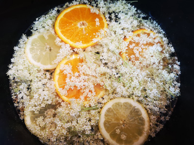 Auch wenn es noch nicht zum kochen kam, hier mal die Vorbereitung, die in 24 Stunden vollendet wird. In einem Sud Minze (ok, der wurde aufgekocht) ziehen jetzt Holunderblüten, Zitronen- und Orangenscheiben. In 24 Stunden wird das Ganze gefiltert und aus der Flüssigkeit dann ein Gelee oder Sirup eingekocht.
