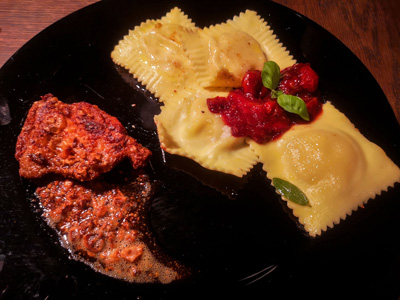 Zweiter Gang waren mit Burrata gefüllte Ravioli, dazu karamellisierte Tomaten und Pollo Fino mit Haselnusskruste. Die Ravioli kommen von Francesco und Raffaela Cucci. Auch der dazu gehörende Wein passte großartig.