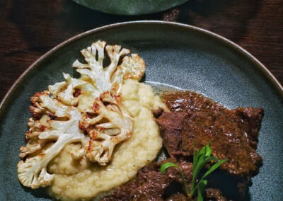 Passt irgendwie zum Essen, dieser Titel. Frühstück haben wir uns gespart, Dinner gab es in Raderach. Und zwar Blumenkohl-Püree mit gebratenen Blumenkohlscheiben. Dazu Rindfleisch angebraten, dann in einer Schmorsoße aus Miso und Apfelschaum eine Zeitlang ziehen gelassen. Der Apfelschaum war mit Tonkabohne aromatisiert. diese Bohne ist ein Muss in der Küche, sollte aber sorgsam und sparsam genutzt werden, weil sie einen Drang hat, direkt zu dominieren. Und das tut nicht unbedingt gut. Die Tonkabohne schmeckt leicht süßlich, erinnert mit leichten Bitterstoffen an Vanille und wird auch als Ersatz für Vanille eingesetzt. Ich halte das für nicht sinnvoll, da Vanille echt am besten schmeckt.
