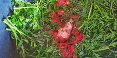 Ein Teil des Rotkohls wird zu einem Salat, gewürzt mit Mole und Kaffee – eigentlich Kaffeeöl, das hab ich aber grad nicht. Mole ist eine fantastische Gewürzmischung aus Mexiko, bestehend aus Chilli, Kakao, Sesam, Tomatenflocken, Knoblauch und in meinem Fall Cashew statt Mandeln. Dazu dunkler Muskovado Rohrzucker. Das ist eine sagenhafte Mischung, mit der ich weiter experimentieren werde.