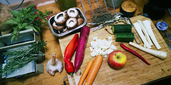 Dieses florale Cover hat mich inspiriert, Gemüse und frische Kräuter wie Rosmarin und Ananas-Salbei aus dem Garten auf die Bühne zu holen. Dazu Resteverwertung.