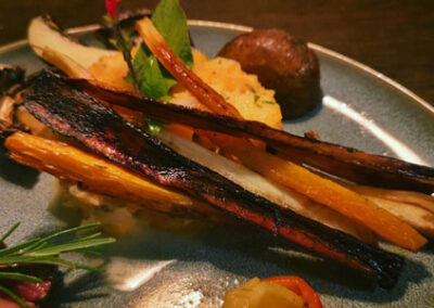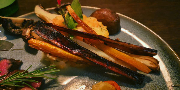 Aus Petersilienwurzel, Pastinaken und Karotten habe ich Spalten mit Honig und Andaliman-Pfeffer gebacken, das ist eine Wildsammlung aus Sumatra, die sehr zitronig schmeckt und pur auf der Zunge prickelt. Der Pfeffer kommt auch in den Salat, der aus Gurken-, Paprika- und Orangenscheiben besteht und mit weißem Acceto und Sel Gris abgeschmeckt ist.
