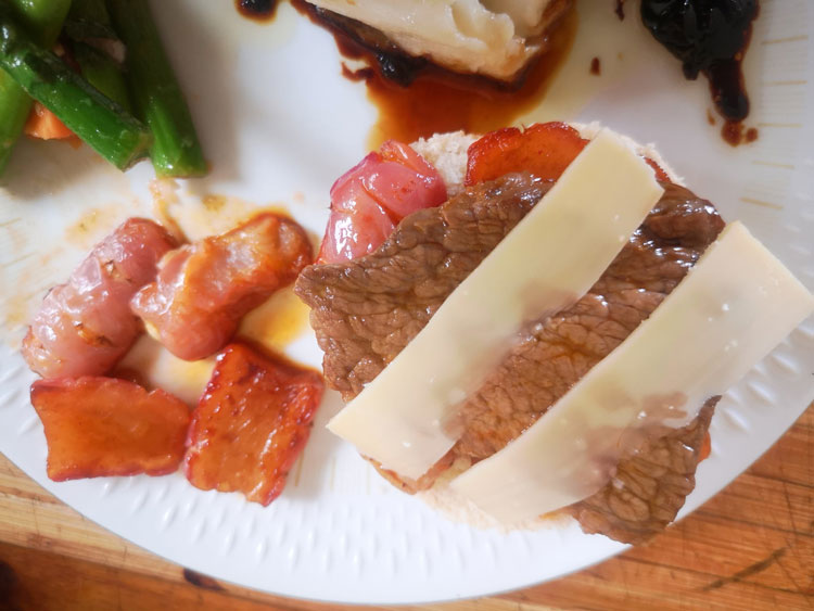 Sauerklee-Wurzeln habe ich karamellisiert und angebraten, dazu Tafelspitzscheiben geschmort – als Burgerauflage.