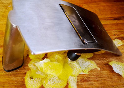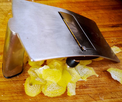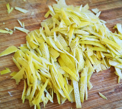 In der äußeren Schale stecken enorm aromatische und kräftige ätherische Öle, die aus normalem Kristallzucker einen Ölzucker machen. Das ist ein Zucker, der ein starkes Bergamotte-Aroma trägt und ölig feucht daherkommt, wegen der Verbindung mit besagten ätherischen Ölen. Viel dosieren muss man da nicht, auf ein Kilo Zucker kommen die Schalen (nur die grün-gelbe äußere Schale fein abgehobelt) von knapp einem Kilo Bergamotte.