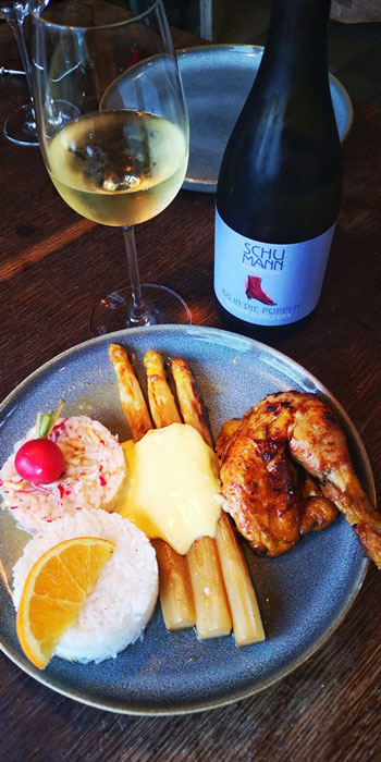 Und dazu gab es den weißen Burgunder von Schumacher – ein Augenzwinkern in Richtung rote-schuhe.de, der aus der Weinhandlung von Marleen Sturm, @Vintage1989, stammt. Der kommt mir sehr stark daher – fast wie ein Grauburgunder – aber passt wunderbar zum Hahn.