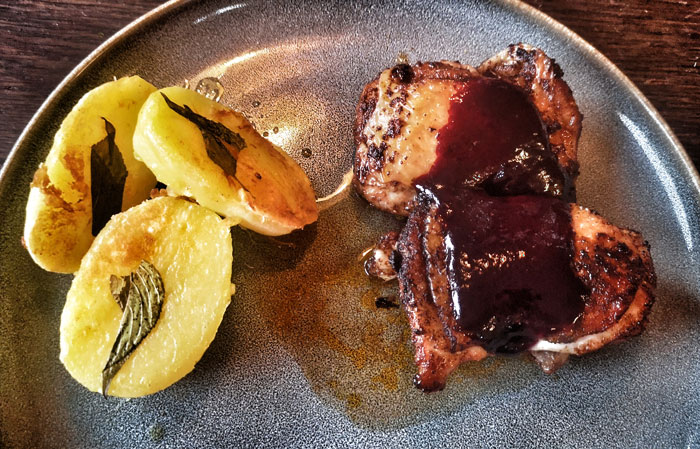 Also habe ich die Trauben durch ein feines Sieb gestrichen und sie als Soße – vollkommen unverändert – genutzt. Auf einem allein mit Paprika gewürzten Polo-Fino spielte sich die Traubencreme mit dem deutlichen, aber sich nicht im Vordergrund aufdrängenden Rosmarinaroma, zu einer wunderbaren Kombination auf. Dazu gab es auf Ananas-Salbei gebackene Kartoffelhälften und eine Soße mit sautierten Kräutersaitlingen.