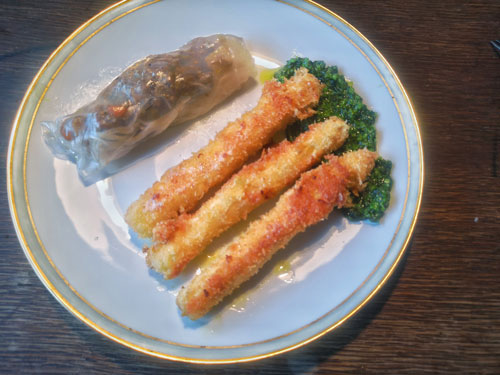 Dim Sum habe ich nicht bekommen und beim Selbermachen bin ich bereits gnadenlos gescheitert. Ging mit vielen Abstrichen auch so. Auf dem Rest der Bärlauchpesto liegen in Pankow-Mehl panierte Spargelstangen. Auch mal was anderes. Und an dem Dim Sum arbeite ich noch, versprochen. Ich habe es im Spielweg-Restaurant gegessen und war schlichtweg begeistert.