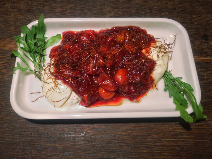 Erst werden kleine Tomaten karamellisiertn und mit Rotwein abgelöscht, danach dürfen sie beinahe zu einer Marmelade einkochen. Sie kommen heiß auf den Burrata, der kurz geflämmt ist und angeschnitten ausfließt. Mit Ruccola wird das Ensemble dekoriert, ich gebe noch Chilifäden darüber. Der Zucker nimmt den Tomaten etwas Säure, Ruccola bringt etwas akzentuierten Bitterstoff und Burrata bildet die Basis.