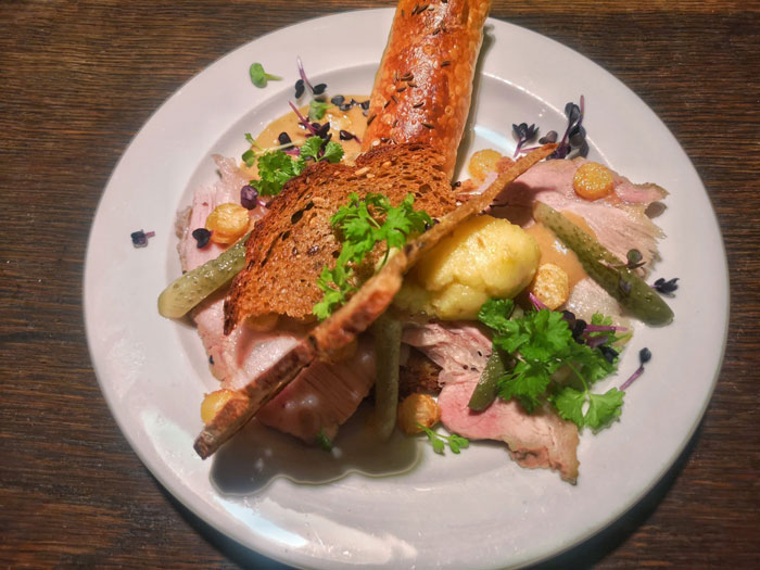 Auf den anderen Teller kommt gebratene Haxe dünn aufgeschnitten auf einem mit Butter getoasteten dunklen Brot und dazu eine Soße aus Senf, Meerrettich, Bierreduktion und Schalotten. Die Haxe wird erst gekocht, danach auf Schalotten im Ofen gebraten, anschließend mit dunklem Weizen und Malzbier kurz weitergeschmort. Sellerietaler werden in Butter geschmort, aus Kerbelwurzel und einer Kartoffel wird ein Püree hergestellt. Irgendwo in Bayern heißt das Zockerbrot.