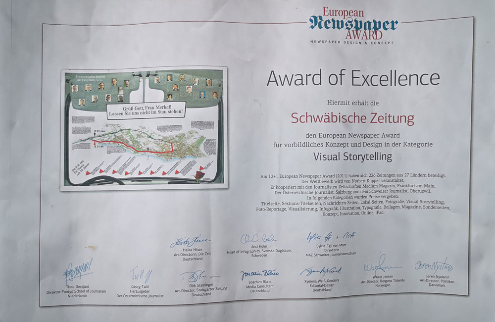 Beim Euorpean Newspaper Award hat die Panoramaseite der Schwäbischen Zeitung Friedrichshafen anlässlich des Besuchs von Kanzlerin Angela Merkel 2011 den Preis für Visuell Storytelling gewonnen. Das Layout und Design einschließlich der Fotos dieser Seite stammten von mir. Die Beiträge haben wir gemeinsam mit Redaktionskolleginnen und Kollegen erstellt.