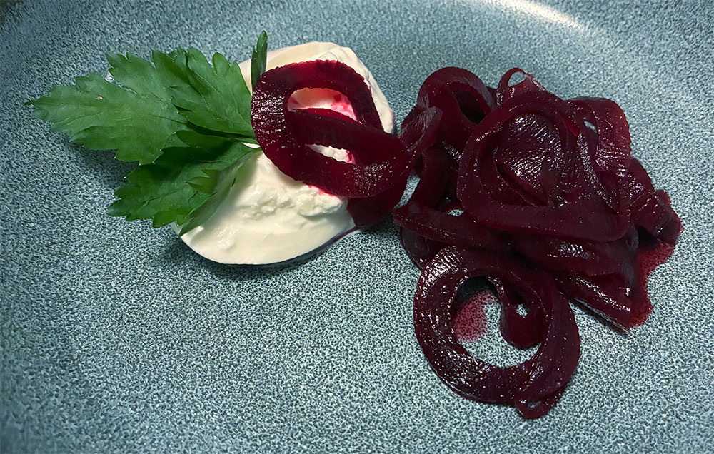 Den Abschluss macht ein Burrata, der statt mit Tomate mal mit gepickelter roter Beete kombiniert wird und mit Berbere herzhaft gewürzt ist.