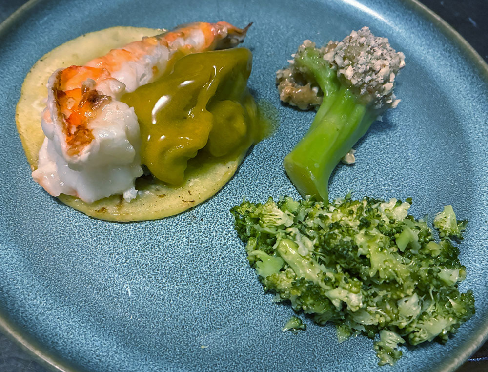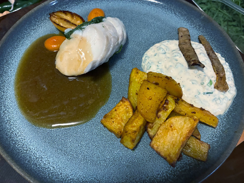 Ein erster Hauptgang besteht aus sous vide gegartem Skrei (eine Stunde auf 56 Grad Celsius, nachdem der Fisch zuvor eine Stunde in 6-prozentiger Salzlösung lag). Zu dem Skrei gibt es Lydias Ofen-Kartoffelspalten mit ihrem Kräuterdip. Danach folgt eine Argentinische Garnele mit Brokkoli-Ästchen und Nusscreme, einer Brokkoli-Nocke aus Brokkoli-Blüten und einer kräftigen Garnelen-Reduktion sowie Bergamotte-Sorbet.