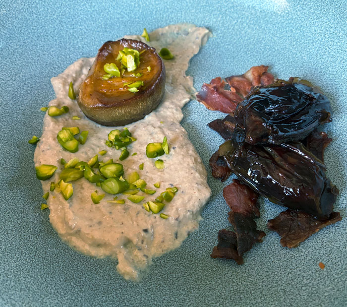 Gebratener Kräutersaitling auf einer Pilzcreme gesellt sich zu Bacon, auf dem eine karamellisierte Dattel liegt. Danach folgt eine gebratene Maultasche mit einem Karotten-Ensemble. Eine gegarte und in Butter gebratene Karotte wird mit gepickelten Karottenscheibchen kombiniert. Die Maultasche ist auf Mandelcreme angerichtet.