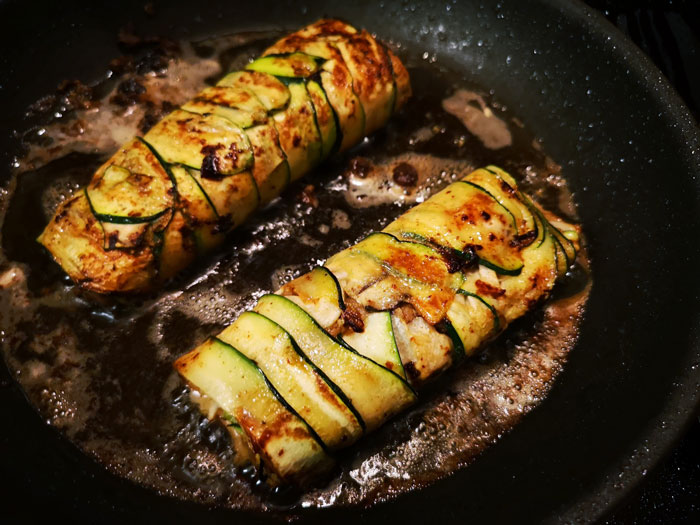 Dazu gab es ein Rehragout in einem stark eingekochten Rindfleischsud, der aus der am Wochenende gekochten Brühe entstand. Parfümiert wurde es mit Orangenschalenabrieb. Das Rindfleisch aus der Rindersuppe habe ich zu einer Farce verarbeitet und in Kräutersaitlinge und Zucchini eingerollt.